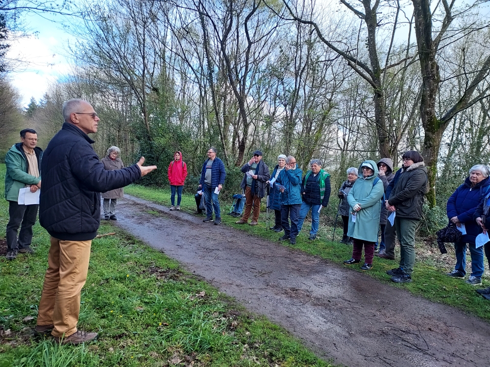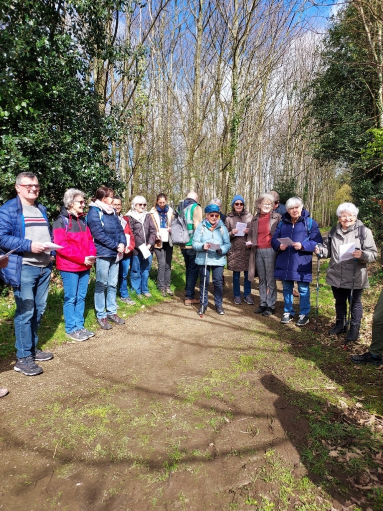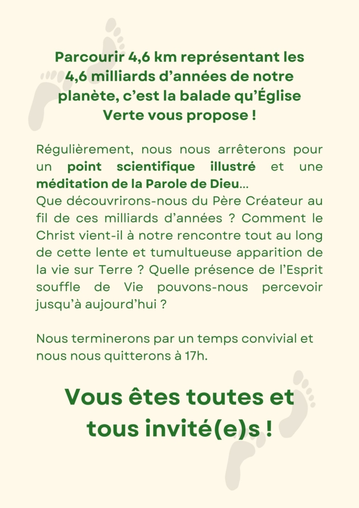 Nous avons donc marché 4,6 kilomètres, chaque kilomètre correspondant à 1 milliard d’années. Notre promenade méditative sur la Création s’est déroulée en dix étapes. A chaque pause, Philippe Barrault nous présentait l’aspect scientifique de la formation de la Terre jusqu’à l’époque actuelle appelée Anthropocène. Puis notre diacre Pierre Jarousseau, nous proposait l’aspect méditatif par une lecture de la Bible accompagnée parfois du chant « Psaume de la création », suivie d’une question qui nous aidait à méditer tout en marchant jusqu’à la pause suivante.